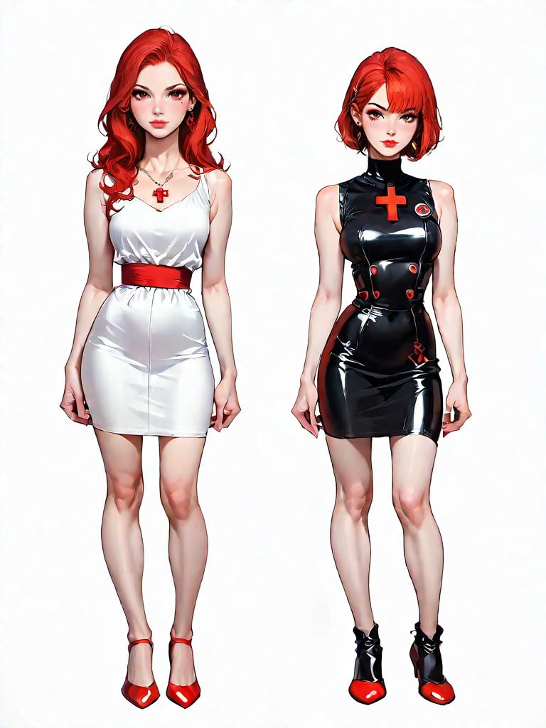 Digital illustration of two full-body portraits of a woman with vibrant red hair and realistic facial features. One wears a white sleeveless mini dress with a red shiny waistband and red heels, accessorized with a subtle red cross pendant necklace and flowing hair. The other wears a black glossy sleeveless mini dress with red accents, a high neck, red cross pendant, and red-tipped black ankle boots, with short hair styled with pins. Both stand against a plain white background.