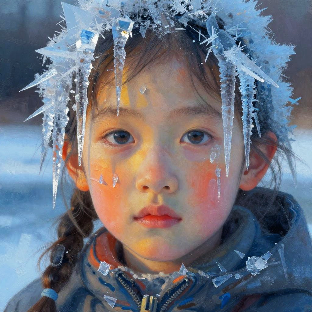 Surreal portrait of a teenage boy's face, with urban skyscrapers and glowing neon signs seamlessly blending into his features. The face is rendered in a painterly style, with intricate brushstrokes capturing both the softness of human expression and the rawness of natural elements. Warm hues of orange and yellow from the city lights radiate across his face, contrasting against cooler blue and icy tones. The composition evokes a sense of energy, with high detail and dynamic light, merging human beauty with the majesty of nature.