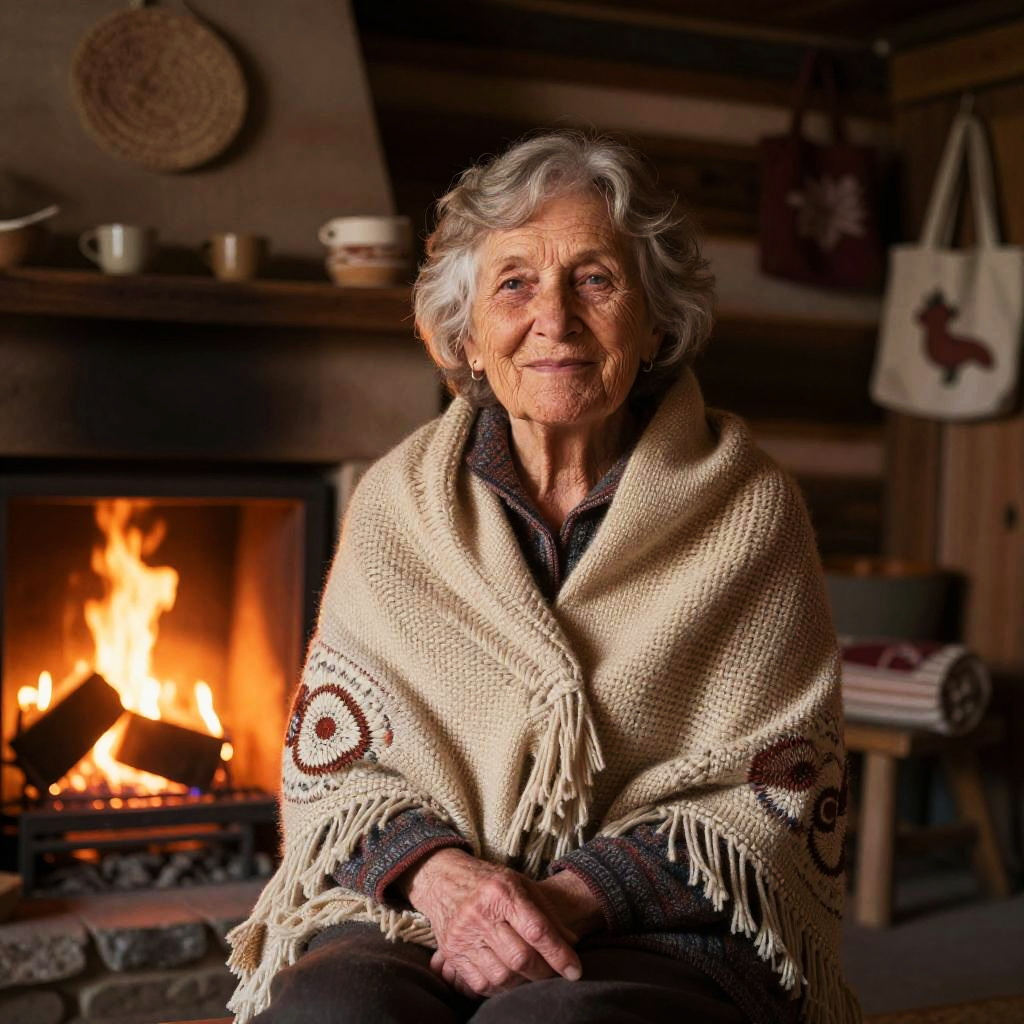 Old tan lady sitting by a cozy fireplace in a rustic cabin, wrapped in a woven shawl, surrounded by handmade crafts and warm glowing light, atmosphere of comfort and wisdom, detailed facial features capturing gentle smile and life experience.
