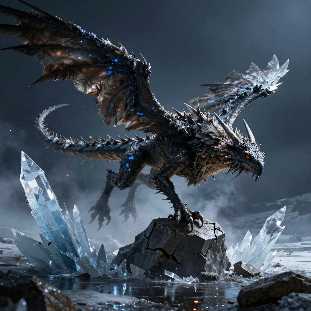 Azure manticore resting atop frosted spires overlooking a moonlit glacial ravine with chilling azure glows flickering along tail barbs, mist curling from breath. Dark fantasy mood, cinematic low-key lighting, intricate feather micro-detail, razor-sharp focus, talons gripping cracked basalt, drifting embers and dust motes, volumetric fog, atmospheric perspective, high contrast, subtle blue rim light, wet reflective surfaces, epic scale, mythic atmosphere, ultra detailed textures, masterful lighting, soft vignette, filmic grain.
