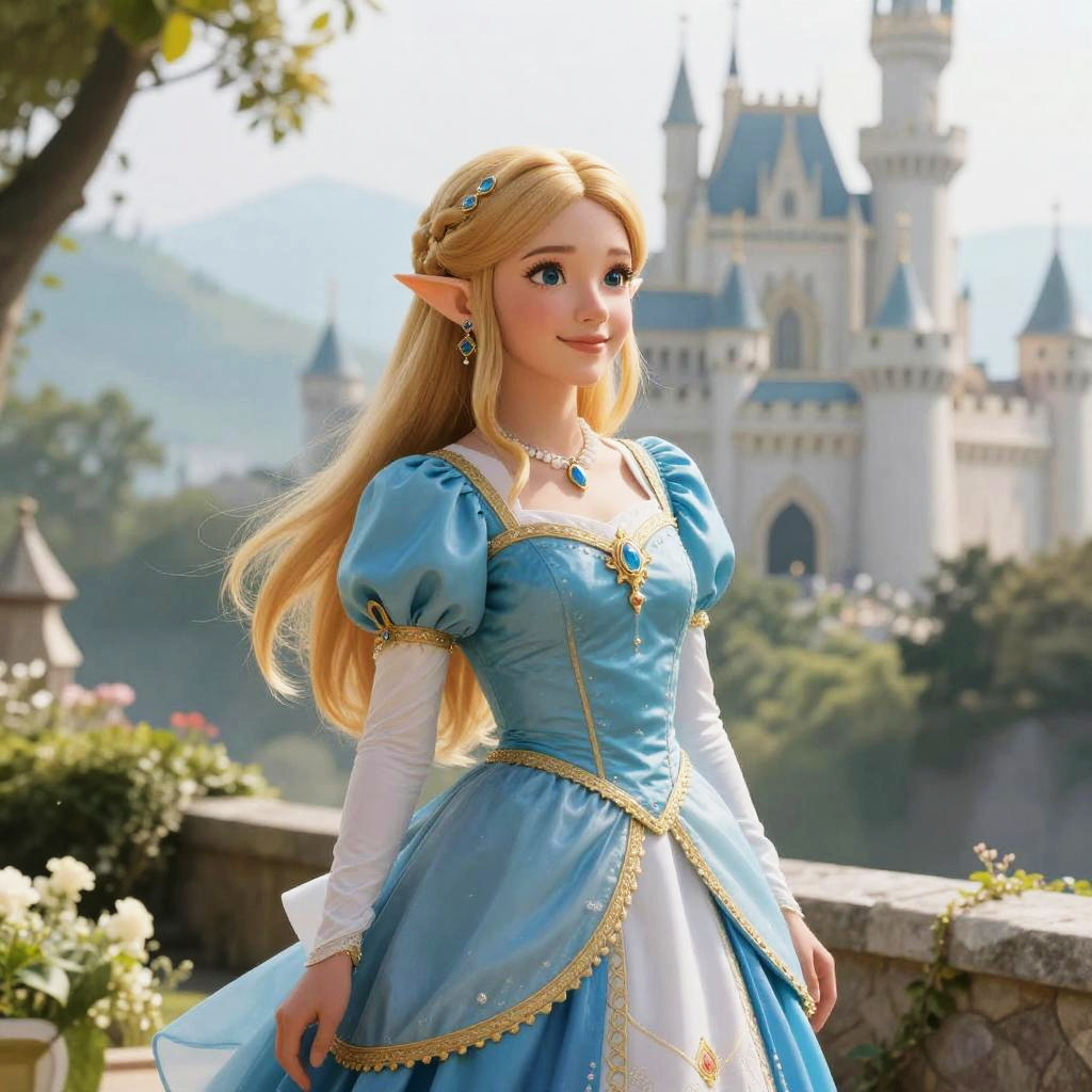 Digital artwork of a blonde, elven princess with blue eyes, wearing a blue and white, puffy-sleeved gown, standing in front of
