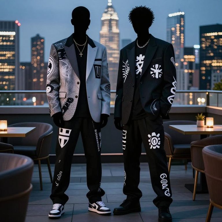 Streetwear influenced suits worn by a silhouette in a rooftop lounge, blending oversized lapels, band tee-inspired graphics, and mesh details with a sleek, modern city skyline glow.