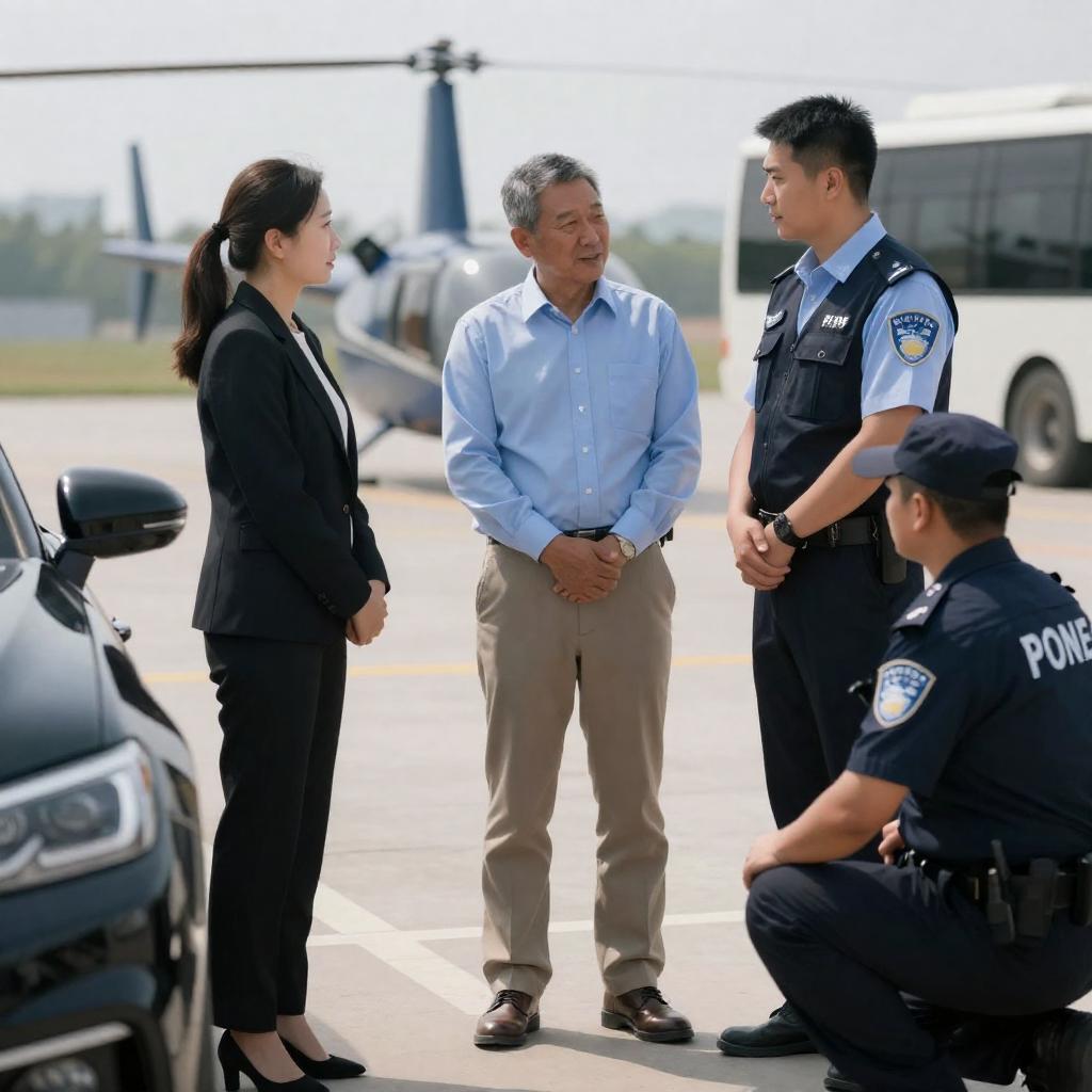 Photograph of a man in a light blue shirt and khaki pants, standing between a woman in a black blazer and a man in a dark vest, talking to a security guard kneeling beside a black car. Helicopter and bus in the background. Bright daylight.