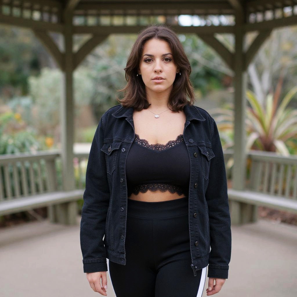 Photograph of a brunette woman with wavy hair, wearing a red sleeveless blouse and black leather pants, standing on a park path with autumn trees