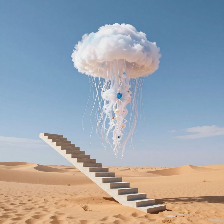 Digital CGI image depicting a surreal desert scene. A white, fluffy jellyfish with blue and black spots hovers above a diagonal staircase, which descends from the bottom left to the center. The staircase is made of gray steps, contrasting with the sandy, sunlit desert landscape in the background. The sky is a clear, bright blue with minimal clouds. The jellyfish's tentacles dangle below, adding a whimsical touch to the stark, minimalist setting.