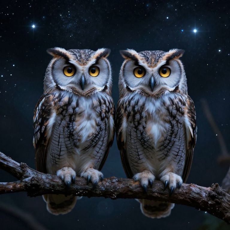 Two ethereal owls perch serenely on a branch, their piercing golden eyes gazing into the infinite expanse of a cosmic void, where the whispers of time and space converge in a haunting symphony of mystery and wonder.
