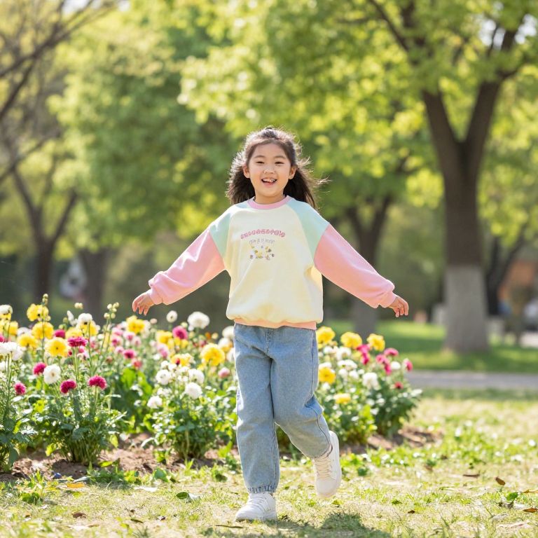 Chubby 12 year old girl playing in a sunny park, wearing casual colorful clothes, smiling happily, surrounded by blooming flowers and green trees, soft natural lighting
