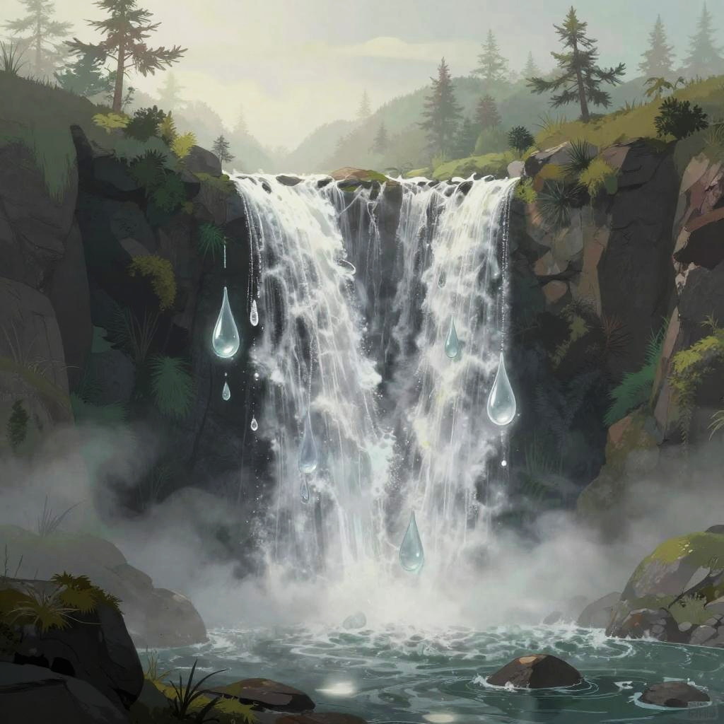 A surreal landscape where giant tears cascade like waterfalls over a rocky cliff edge, mist rising in the air, ethereal mood with muted colors and soft glowing light, invoking themes of sadness and release in a fantasy digital art style.