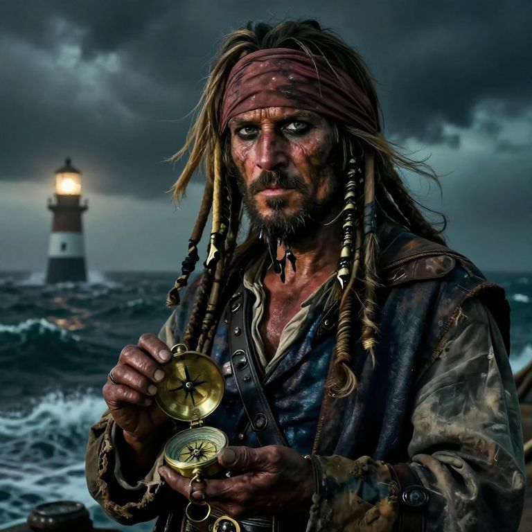 Craft a hyperrealistic portrait of an enigmatic sea captain, his weathered visage bearing the marks of time's passage, clad in a tattered coat. In his leathery hands, he holds an antique brass compass. The backdrop is a stormy ocean beneath a brooding sky, illuminated only by the distant flickering light of a lighthouse. Dramatic lighting casts shadows across his face, revealing creases and a piercing gaze that hints at secrets from countless voyages. This weathered sailor, who has braved the elements for decades, exudes an air of adventure, longing, and introspection.