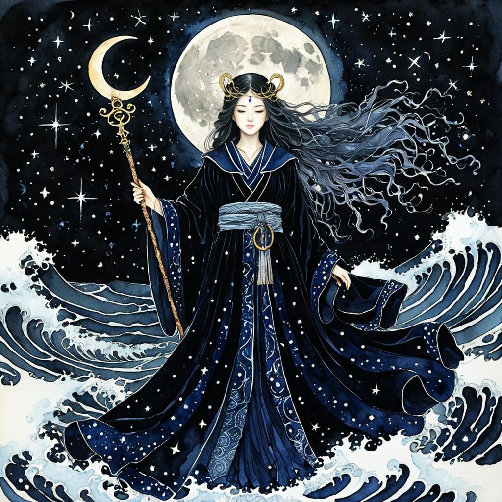 Aeris Dawnbringer, A radiant, winged herald with feathers cascading in hues of dawn. She wears a gown made of iridescent moonlight and carries a staff crowned with a crescent moon, gouache painting, by Alan Lee