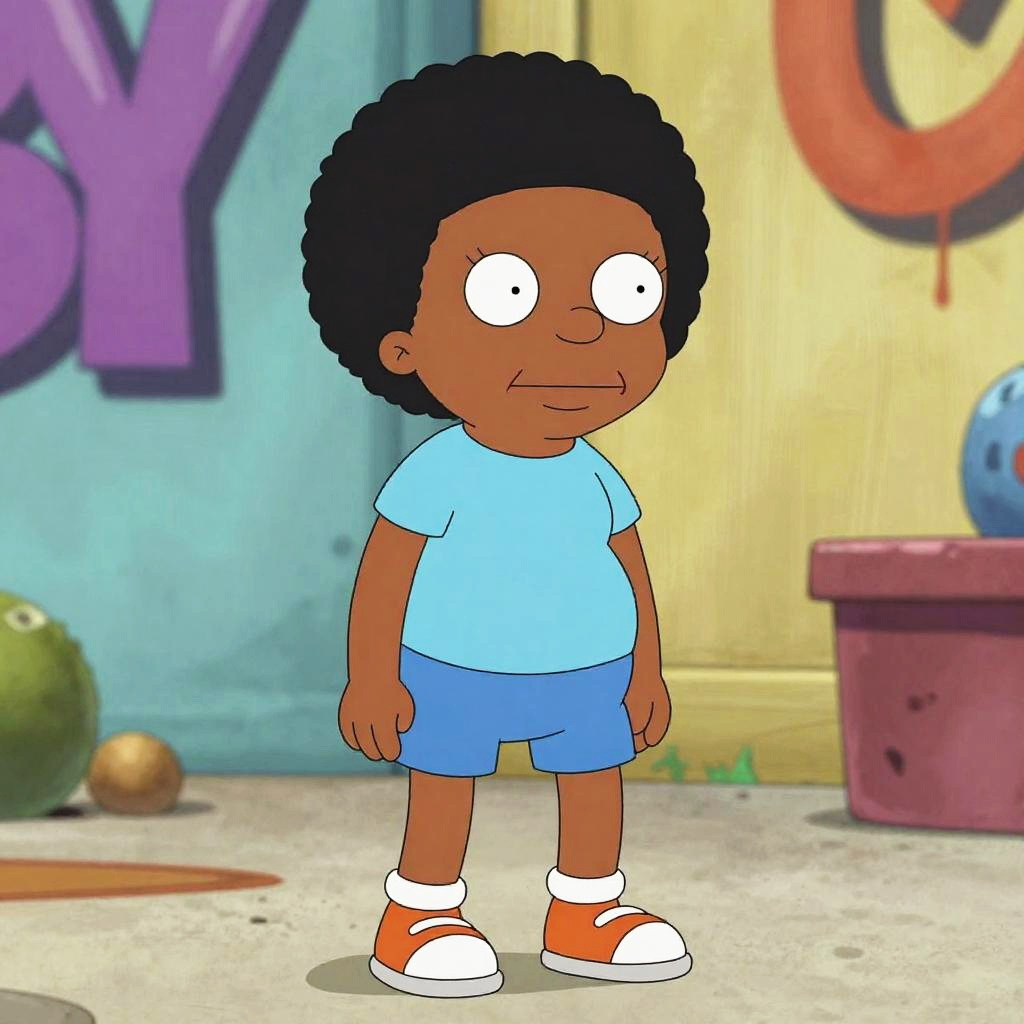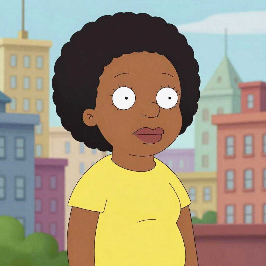 Black woman Cartman styled character, vibrant South Park animation style, bold colors, playful expression, urban background, dynamic poses, digital art