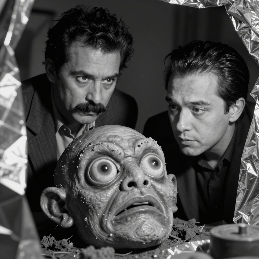 Black-and-white photograph of two men examining a grotesque, mask-like creature with large, bulbous eyes and a twisted face. The men have intense expressions; one has a thick mustache and dark hair, the other is clean-shaven with slicked-back hair. They are surrounded by reflective, metallic surfaces. The creature's ure is rough and wrinkled.