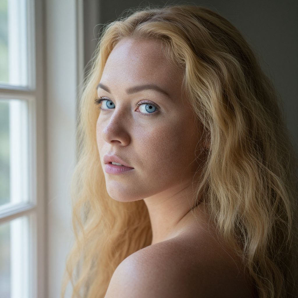 Photograph of a fair-skinned woman with long, wavy blonde hair and striking blue eyes. She has subtle freckles across her nose and cheeks, and her expression is neutral, with slightly parted lips. She is facing slightly to the right, looking over her shoulder towards the camera. The background is dark, with a window to the left casting soft, natural light on her face. She appears to be topless, with her bare shoulders visible. The lighting highlights her smooth skin and the natural texture of her hair. The overall mood is intimate and contemplative.