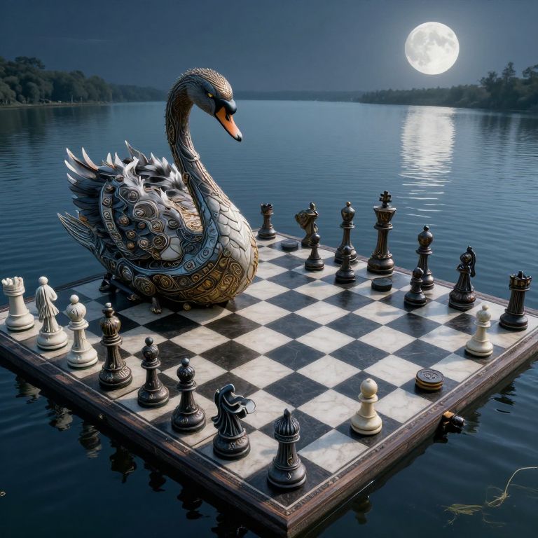 A surreal, digital artwork depicts a chessboard in a mystical forest at night. The board, with moss-covered squares, features intricately carved white and brown chess pieces. Two white doves with outstretched wings hover above the board, illuminated by the full moon hanging in the dark, dense forest canopy. The scene is rich with detailed textures; lush green foliage, ferns, and forest plants surround the board. The moonlight casts a soft glow, enhancing the magical atmosphere. The chess pieces and board are positioned centrally, with the doves symmetrically placed above them, adding a sense of balance and harmony to the image.