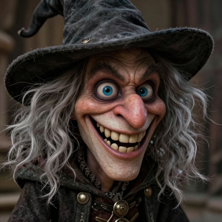 The image depicts a whimsical, fantastical character with a mischievous expression. The character has a large, misshapen nose and a wide, crooked grin revealing uneven teeth, exuding a sense of wicked humor. Their eyes are wide and blue, adding to the eerie charm. The character's hair is wild and gray, cascading in a messy, untamed manner. They are wearing a dark, pointed hat that sits askew on their head, further enhancing their eccentric appearance. The character's clothing is a dark, textured fabric with metallic buttons and intricate designs, suggesting a medieval or fantasy setting. The overall composition is dynamic, with the character's face and hair dominating the foreground, while the background is blurred and indistinct, keeping the focus on the character's exaggerated features and expression.