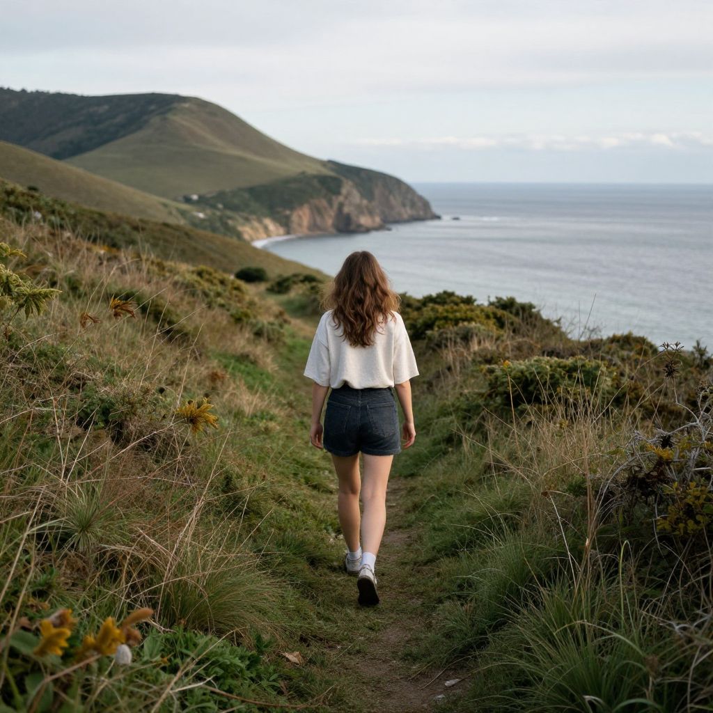 A woman walks along a narrow grassy path surrounded by wild vegetation, with a serene coastal landscape featuring rolling hills and a calm sea in the background.