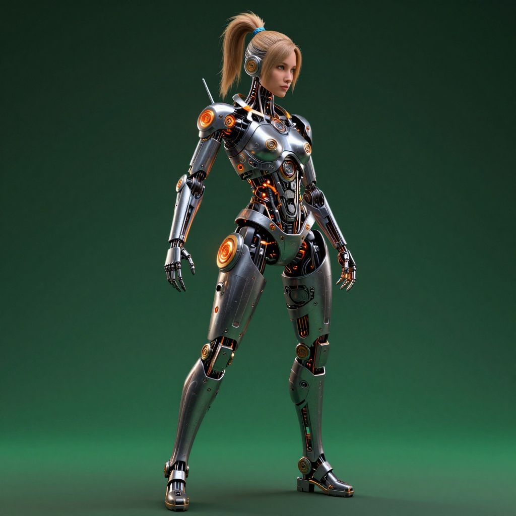 The image showcases a highly detailed, full-body shot of a cybernetic woman, with intricate mechanical components and a striking contrast of metallic and organic textures. Her body is adorned with various mechanical parts, including gears, circuits, and pipes, which are illuminated with a warm, orange glow, suggesting internal energy or power sources. The woman's hair is styled in a high ponytail, adding a touch of human-like appearance to her otherwise mechanical form. The background is a gradient of dark green, which accentuates the vibrant colors and intricate details of the cybernetic components. The overall composition is dynamic, with the woman's posture slightly angled, giving a sense of movement and life to the otherwise static mechanical structure.