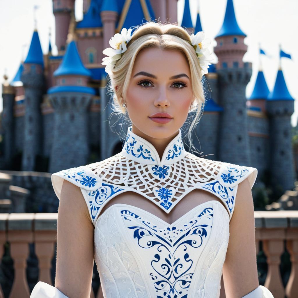 Fair-skinned blonde woman with blue eyes wearing an elegant white sleeveless dress with intricate blue patterns, high collar, and decorative slits. She has a serious expression, white flower hairpieces, and stands in front of a fantasy castle featuring blue rooftops and white architecture. The image is daylight with soft shadows and a slightly blurred background, evoking a fairytale, Disney Princess aesthetic.