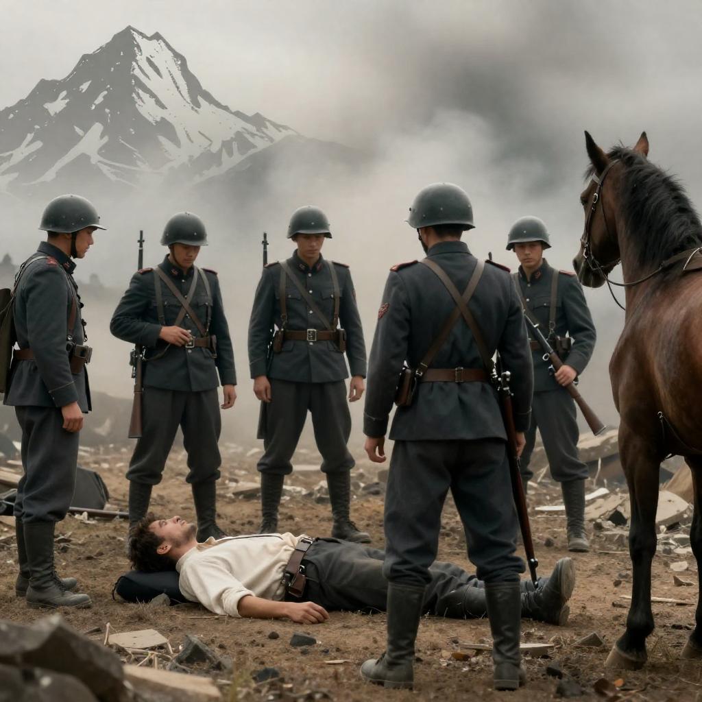 Photograph of a war scene from a movie poster. Soldiers in dark uniforms with helmets and rifles surround a wounded man in a white shirt lying on the ground. A horse's rear is in the foreground. The background shows smoke and rubble. The left side has bold and a mountain illustration.