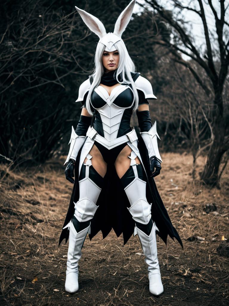 Layla moonknight costume, 1girl, solo, long hair, armor, red eyes, helmet, white hair, breasts, animal ears, viera, boots, full body, rabbit ears