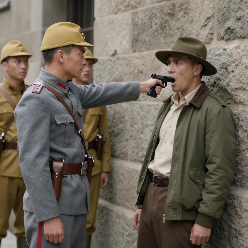 Photograph of two men in a stone wall. Soldier in gray uniform and cap points gun at crouching man in brown clothing, holding another gun. Crouched man's mouth open in shout. Soldier's face intense, crouched man's face intense. Soldier on left, crouched man on right. Background includes stone wall and part of a cart.