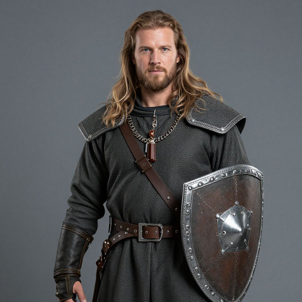 Man with long blonde hair and beard wearing a black and gold costume with gold accents.