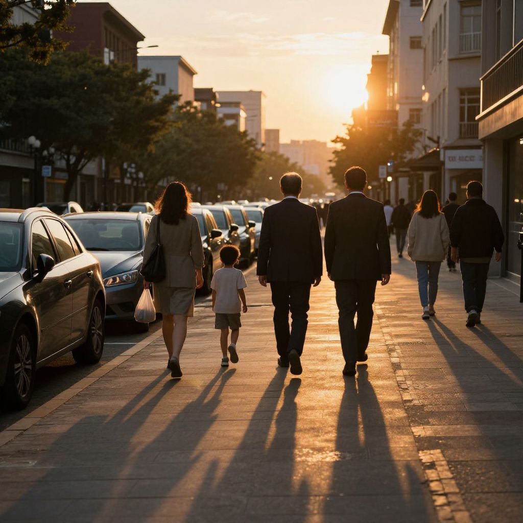 Sunset bathes a bustling city street in golden hues, casting elongated shadows as four figures—a woman carrying a bag, a child, and two men in suits—walk together toward the horizon, while parked cars line the left side and pedestrians stroll along the right sidewalk.
