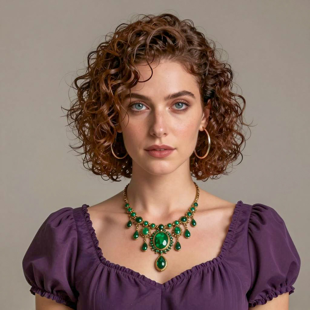 Wet curly wig style, digital portrait of a beautiful woman with short, curly brown hair, light skin, blue eyes, wearing a dark purple dress with puffed sleeves, ornate green and gold necklace, large hoop earrings, neutral background, realistic style, slight 3D effect, focused expression, subtle makeup, soft lighting, centered composition, detailed ures, portrait orientation