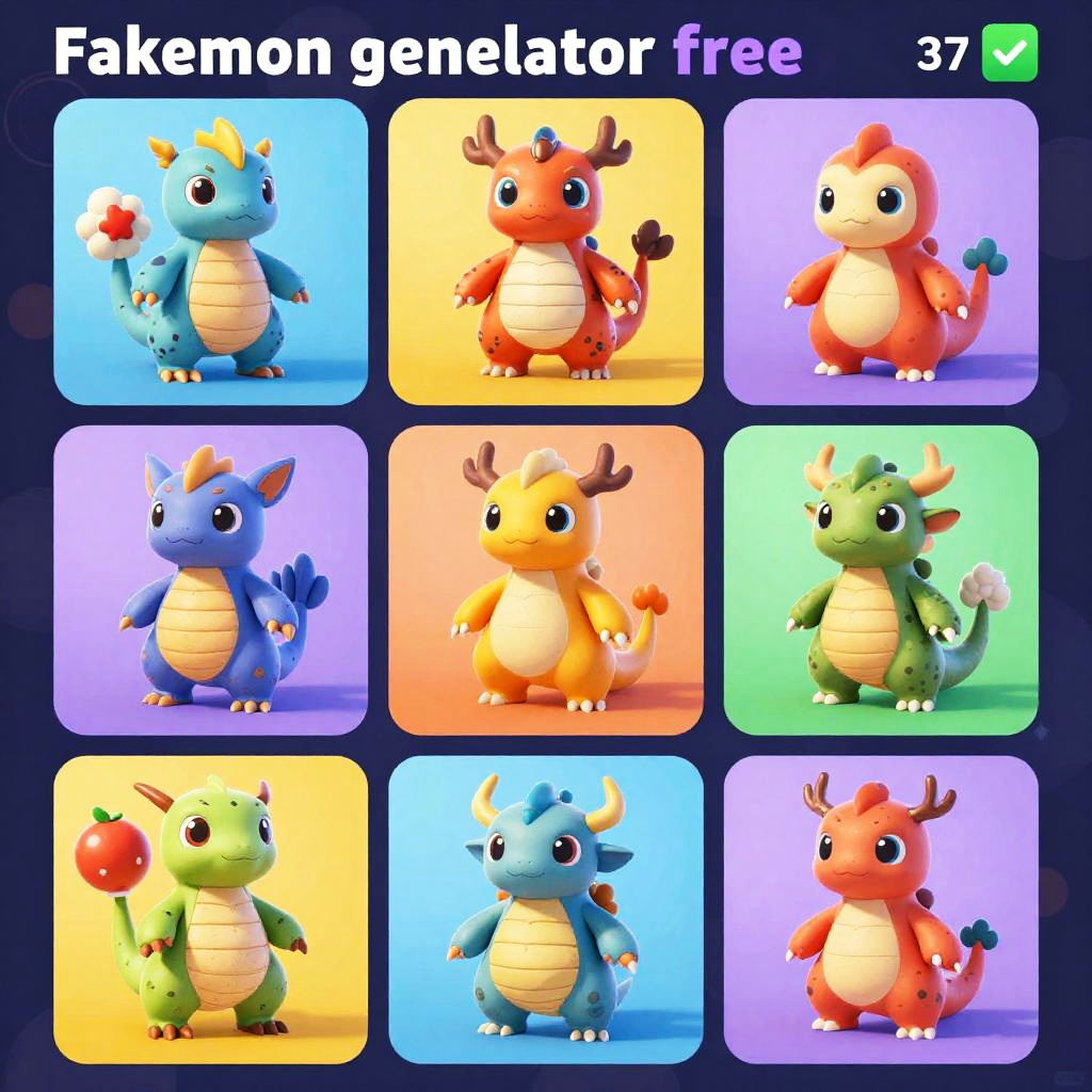 Fakemon generator free concept selection screen depicting multiple original creatures grouped by types, each with detailed designs and stats, colorful and immersive interface, vibrant fantasy digital art style