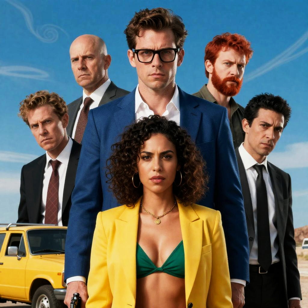 Photograph of six people standing behind a red, weathered truck. Central male with dark hair, black jacket, white shirt, pointing forward. Surrounding men and women with guns, diverse appearances, intense expressions. Topless man with curly blonde hair on right. Background white.