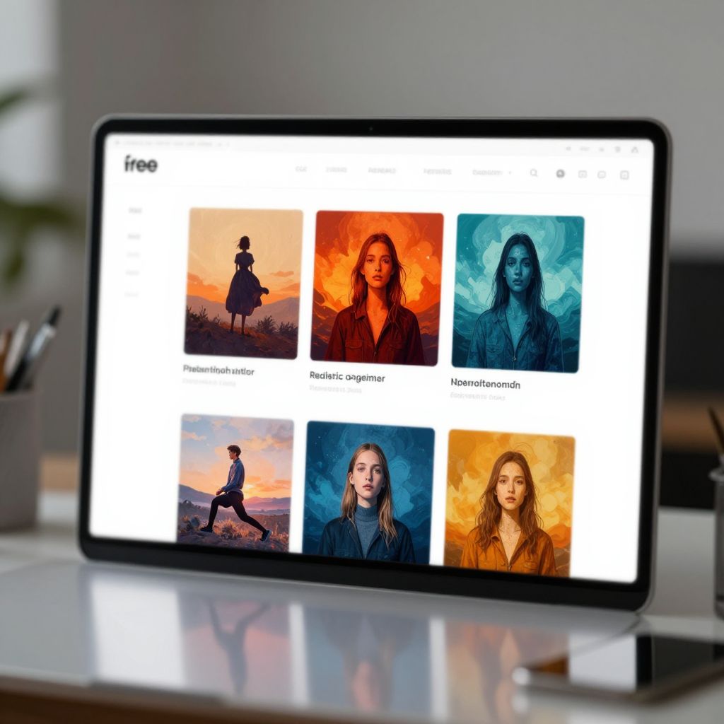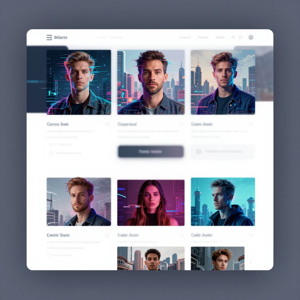 AI art websites presenting galleries of synthetic portraits and futuristic cityscapes, enhanced with glitch art effects and vibrant digital color palettes, ultra-detailed AI-generated visuals framed by minimalist, user-friendly web design with a cyber aesthetic.