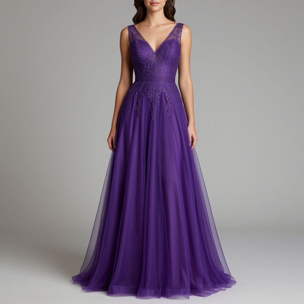 Elegant woman showcasing a vibrant purple V-neck prom dress featuring intricate lace detailing above a flowing tulle skirt, exuding sophistication against a neutral backdrop.