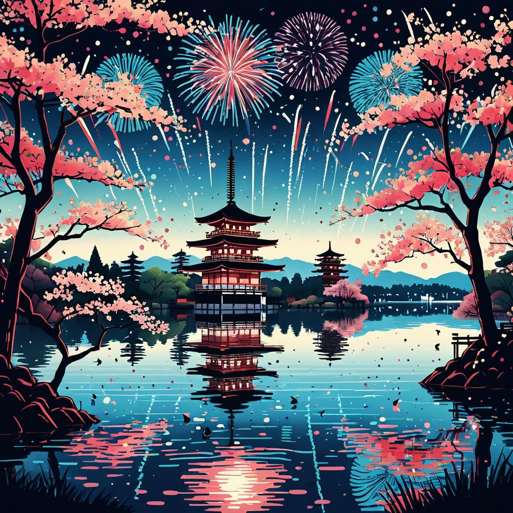 Illustration of a large lake with a Japanese pagoda temple in the distance, colorful and very detailed, fireworks reflecting in the water, surrounded by cherry blossom trees, flat vector style, vibrant and playful