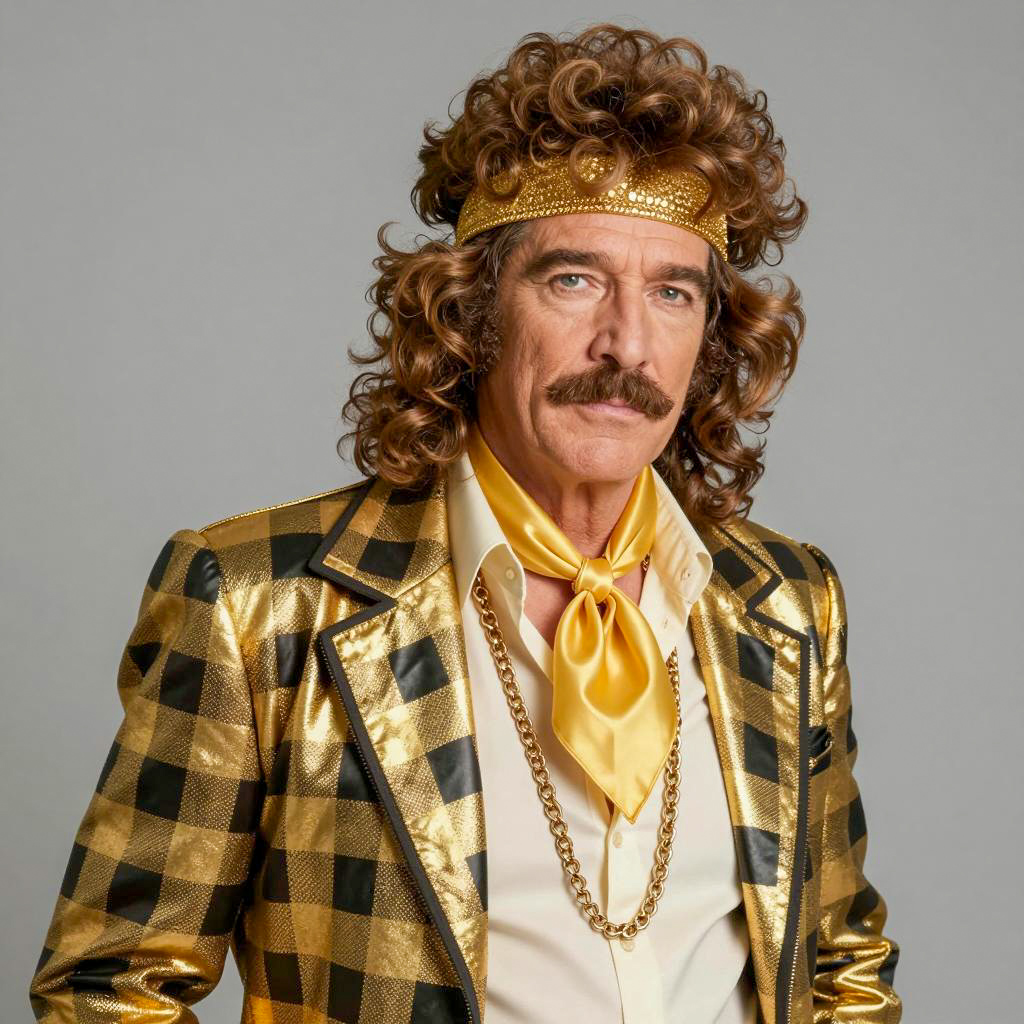 Middle-aged man with long, curly brown hair and pale skin sits on a bed, wearing a striped white shirt. He looks to the right with a slight smile. Dark background with blue curtains. His left leg is bent, wearing black pants. Wooden headboard in the background.