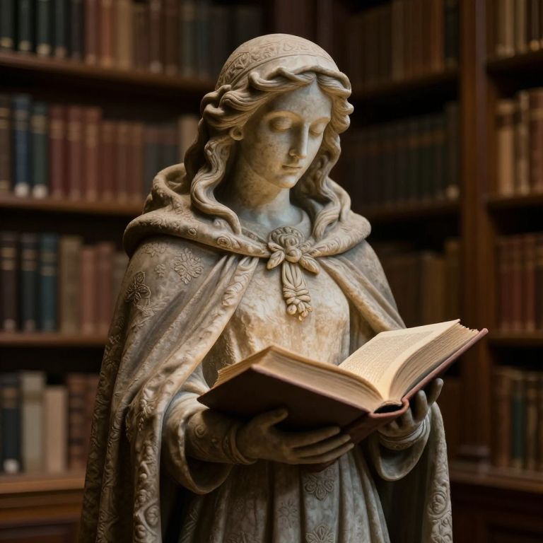 Photograph of a library featuring five white marble statues of children dressed in medieval-style robes. Each child holds an open book, standing in a row facing forward. The central statue is slightly larger, with detailed textured clothing and a serene expression. The background showcases tall wooden bookshelves filled with books, creating a warm, scholarly atmosphere. The statues are evenly spaced along the aisle, with the central figure prominently positioned in the foreground, while the others recede into the background, adding depth to the image. The lighting is soft, highlighting the statues' intricate carvings.