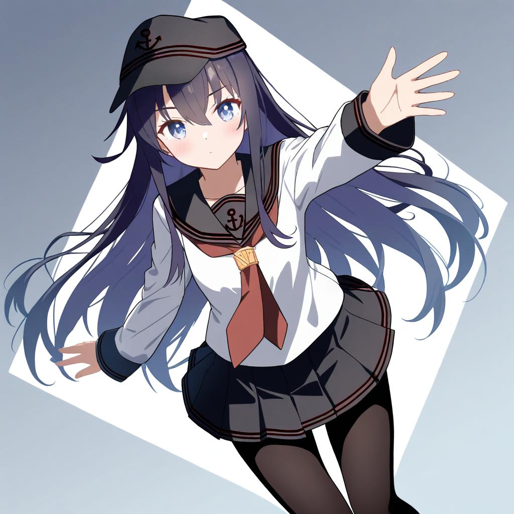 Akatsuki kai ni (kancolle), kantai collection, 1girl, purple eyes, hair between eyes, blue eyes, long hair, purple hair, black hair, serafuku, serafuku, flat cap, pleated skirt, black skirt, black pantyhose, long sleeves, anchor symbol, red neckerchief, by artist mishima kurone, animagine