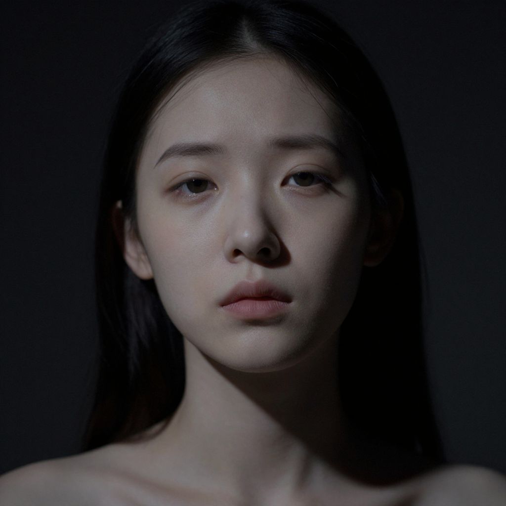 Photograph of a young Asian woman with long black hair, pale skin, and neutral expression, illuminated against a dark background.