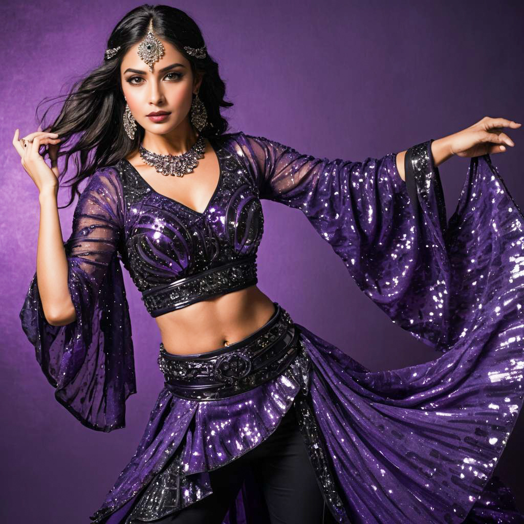 Belly dancer outfit, worn by energetic dancer, featuring sequined crop top and layered maelstrom tunic, in deep purple and shimmering black, captured in vivid performance shoot.