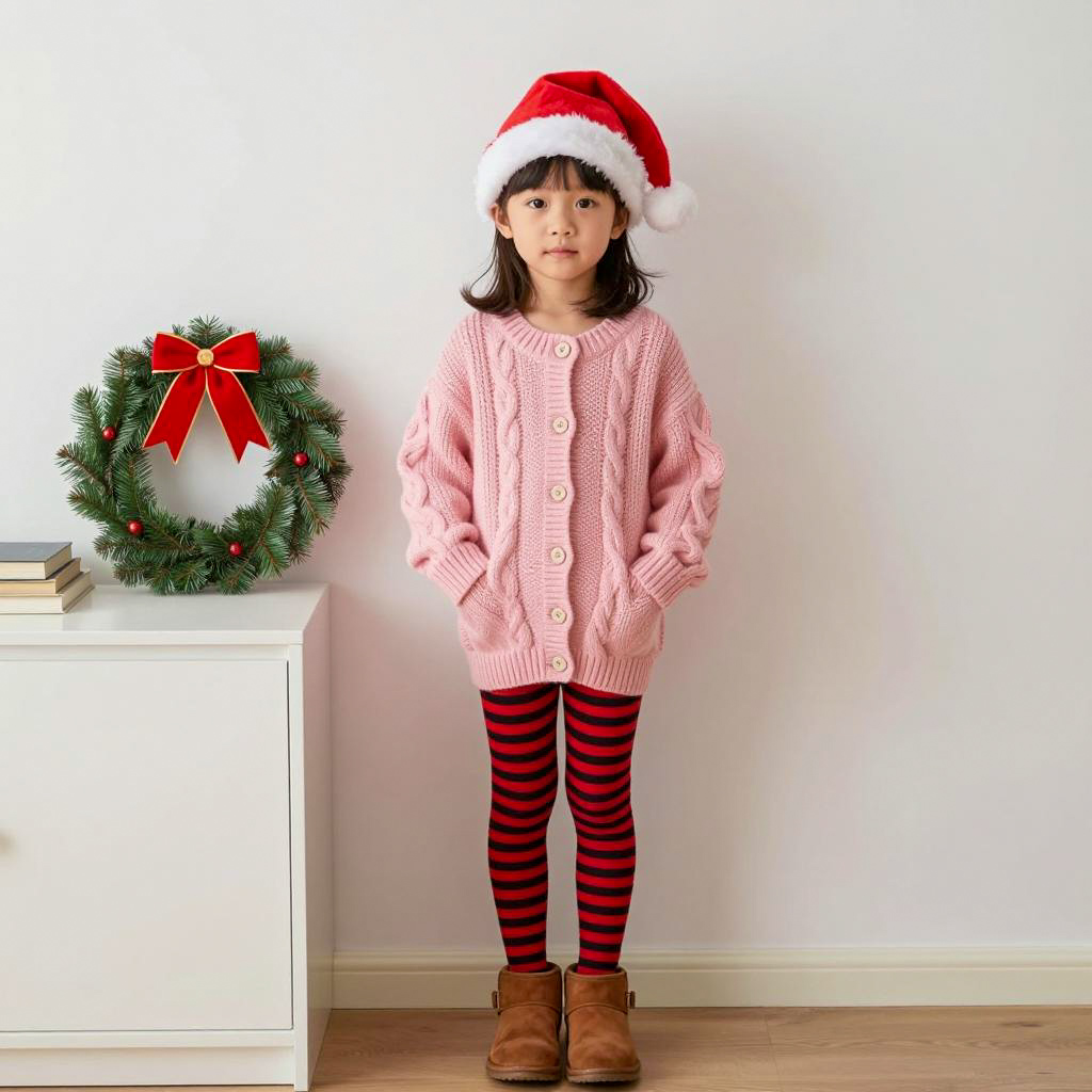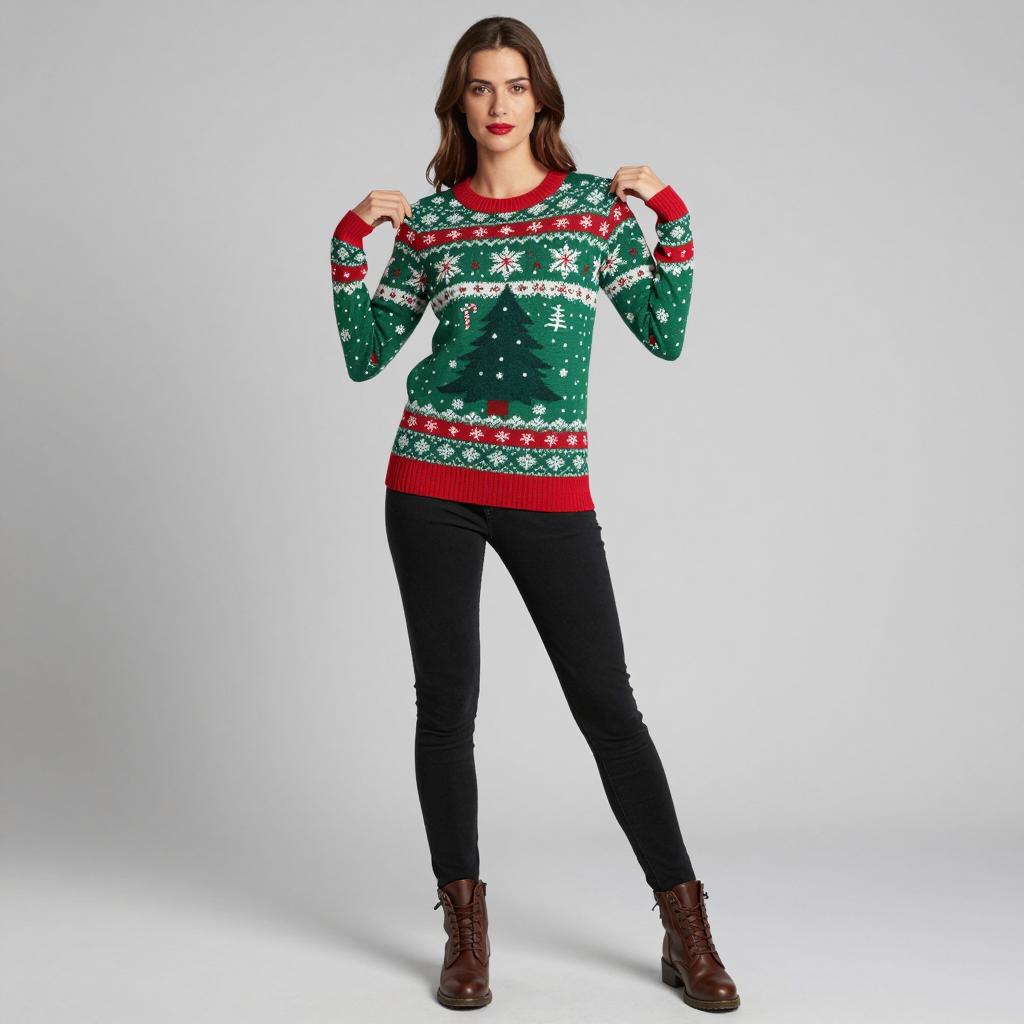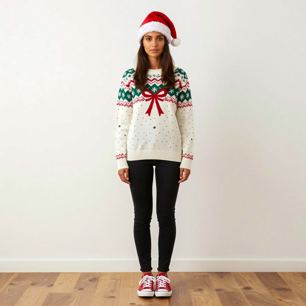 Pretty christmas sweaters, photograph of a young woman, standing, full body, white background, wearing a christmas-themed white sweater with red and green patterns, red ribbon design on chest, red hooded santa hat, black skinny jeans, red and white sneakers, medium brown skin, long dark brown hair, light makeup, neutral expression, casual style, wooden floor, studio lighting, holiday fashion, cozy winter outfit, flat stance, centered, portrait orientation