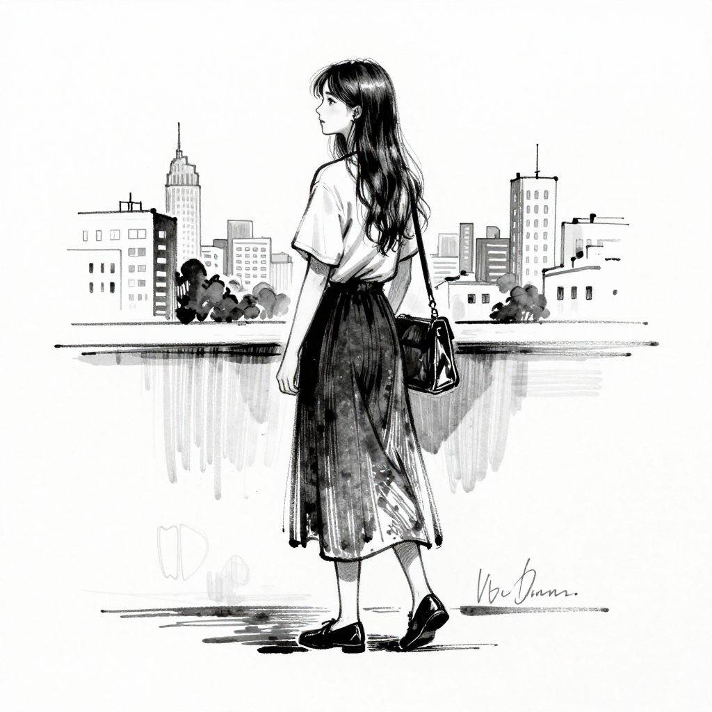 Black-and-white manga-style drawing of a woman with long black hair, wearing a white blouse and black skirt, walking down a narrow, sunlit alley