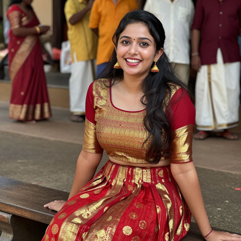 A lively young woman in her late 20s dressed in a stylish onam salwar costume with bold red and gold patterns, her face glowing with joy, smiling with full lips and natural freckles, sitting on a wooden bench in a traditional Kerala village during a local Onam celebration.. The woman has big tits and cute face