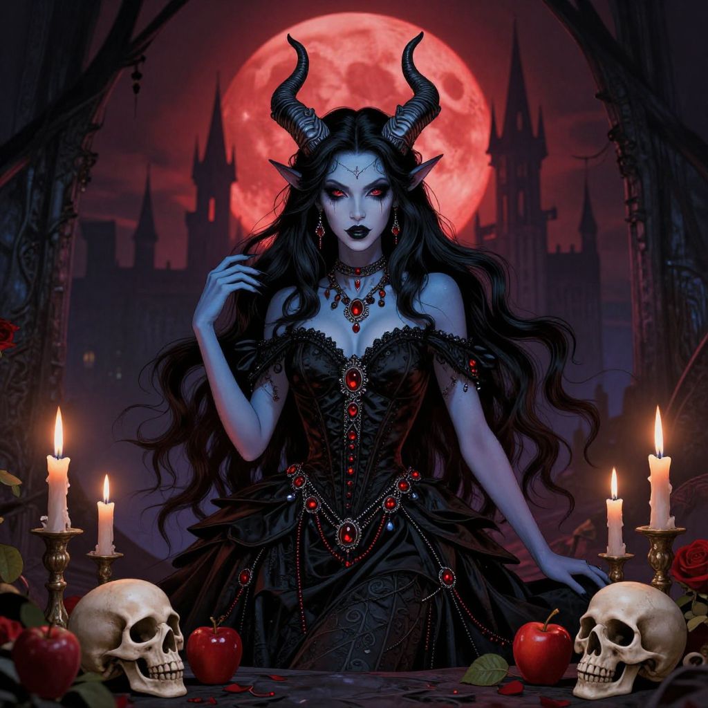 Succubus ahegao pose, alluring demoness with crimson skin, long flowing hair, open mouth expression, surrounded by mystical smoke and dark magic symbols, high detail fantasy art style