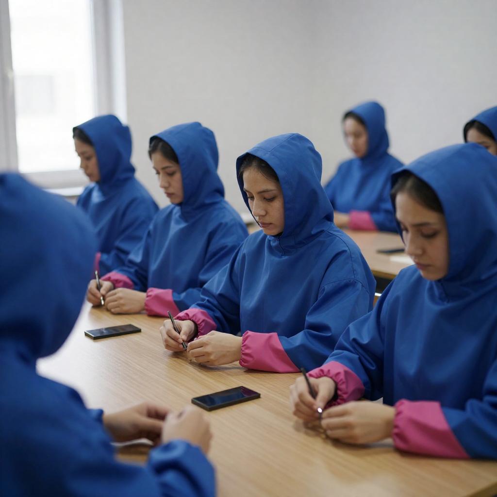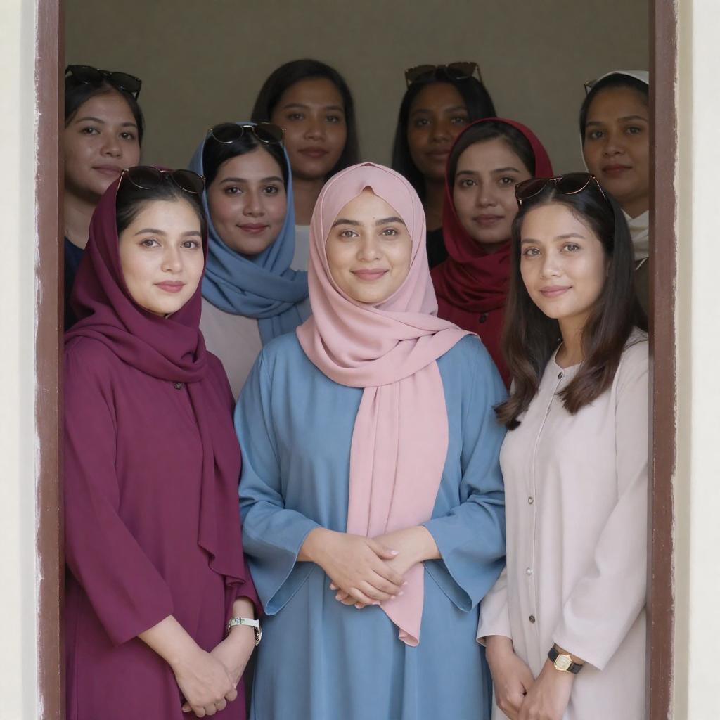 Photograph of six women in black headscarves and dark clothing preparing food at a wooden table. They are focused on various tasks: peeling vegetables, mixing, and chopping. Table holds bowls, baskets, onions, and green herbs. Background features a window, cross, and kitchen items. Women's expressions are concentrated.