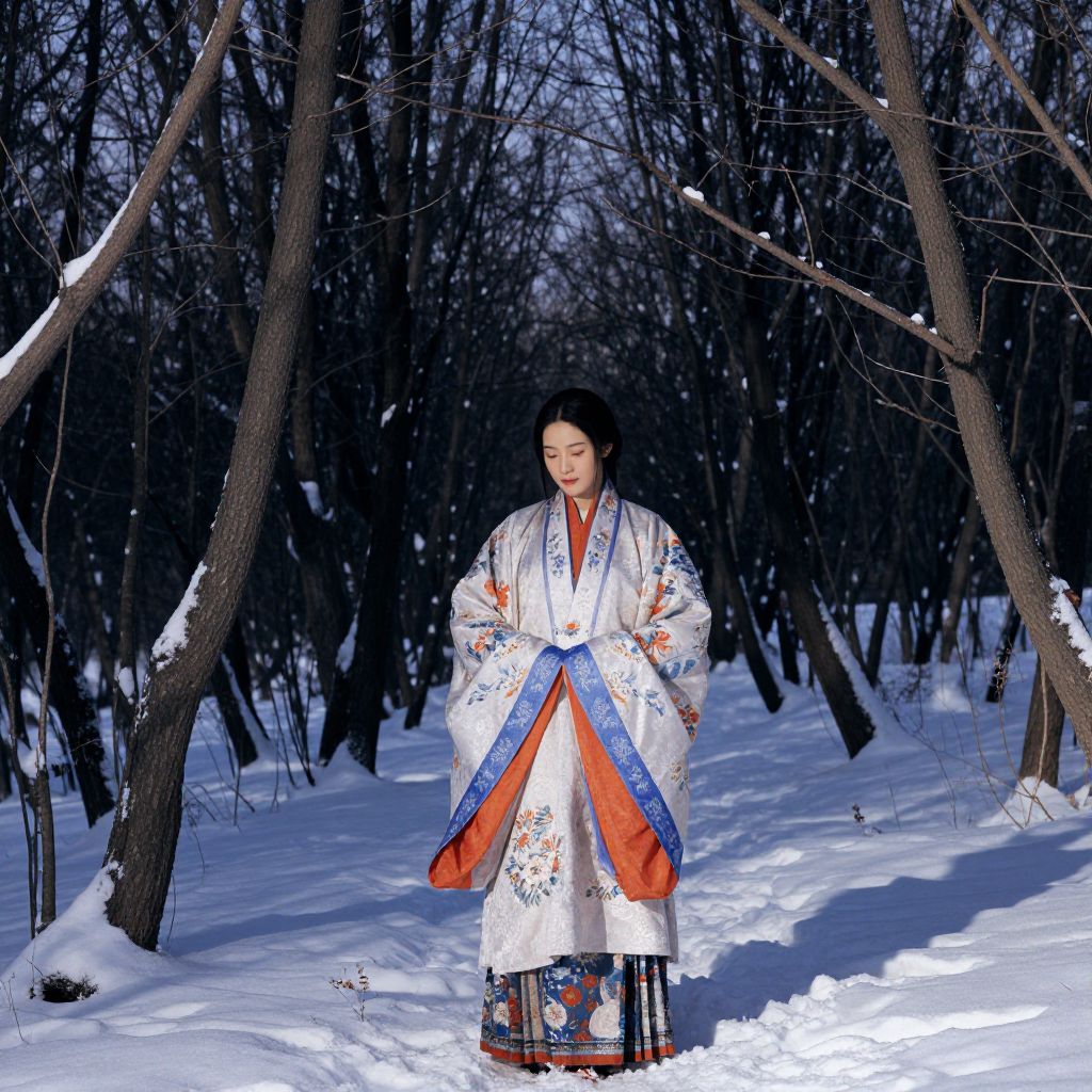 In the style of Victo Ngai, this image presents a beautifully detailed scene of a woman in a snow-covered forest. She is adorned in a national robe, which is intricately designed with floral patterns and textures that evoke a sense of winter's beauty. The robe is predominantly white, with shades of blue and orange, creating a striking contrast against the dark, snowy landscape. The woman stands amidst a forest of bare, leafless trees, their branches reaching upwards, creating a sense of depth and perspective. The interplay of light and shadow, along with the vibrant colors of the robe, enhances the overall composition, making it a captivating visual experience. The snow on the ground and the trees adds a layer of texture and realism to the scene, while the woman's serene expression and the serene atmosphere of the forest create a sense of tranquility and wonder.