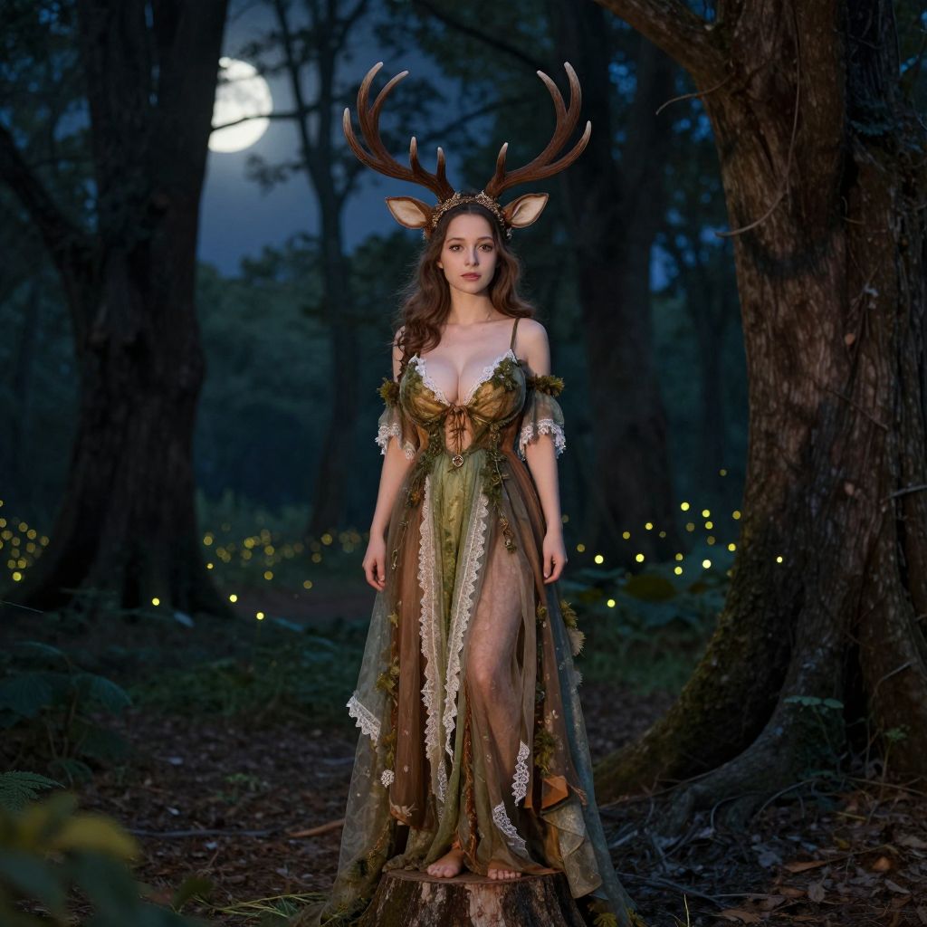 A cinematic photo of a young woman in a handcrafted deer fairy costume, standing on a tree stump in a dreamy enchanted forest at dusk, her face illuminated by soft moonlight, with a serene and ethereal expression, wearing a detailed deer-horn headpiece and a flowing, moss-colored gown with fairy lace trim, the background showing fireflies and tall, ancient trees.. The woman has big tits and cute face