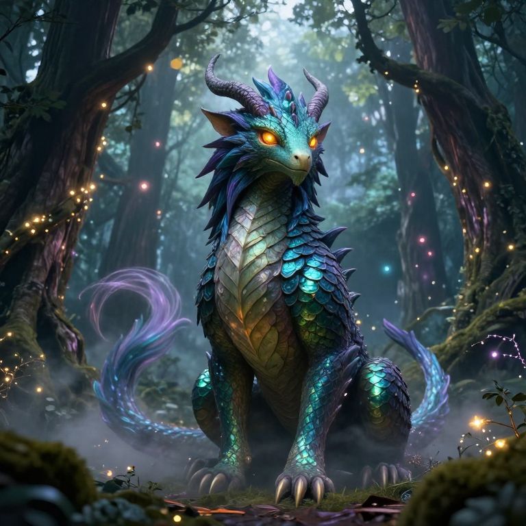 Atyles mythical creature in an enchanted forest, majestic beast with glowing eyes and intricate scales, surrounded by swirling magical mist, ancient trees and sparkling fairy lights, vivid colors and rich textures, fantasy art style