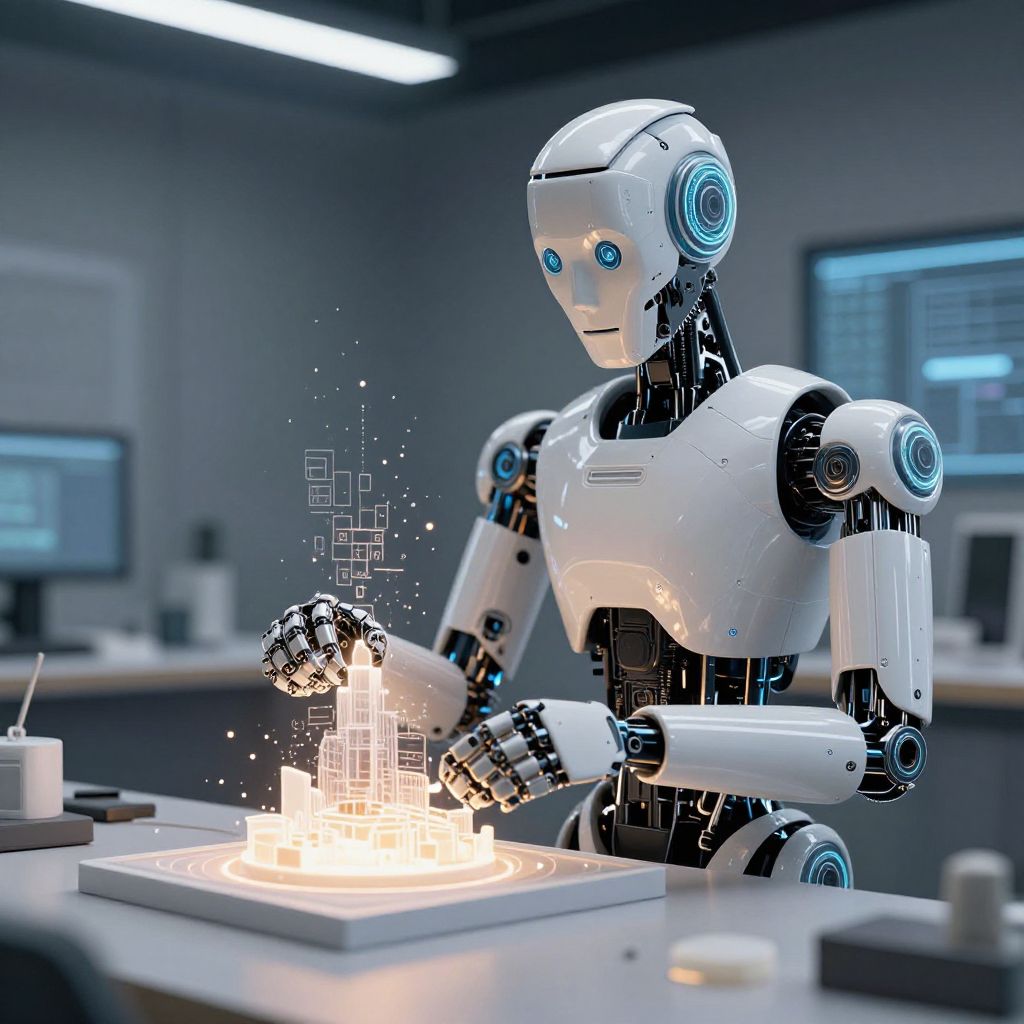 Text2video innovation depicted as a robot artist creating video frames from floating text in a high-tech studio, intricate mechanical details, cinematic lighting with soft shadows, vibrant color palette, photorealistic style