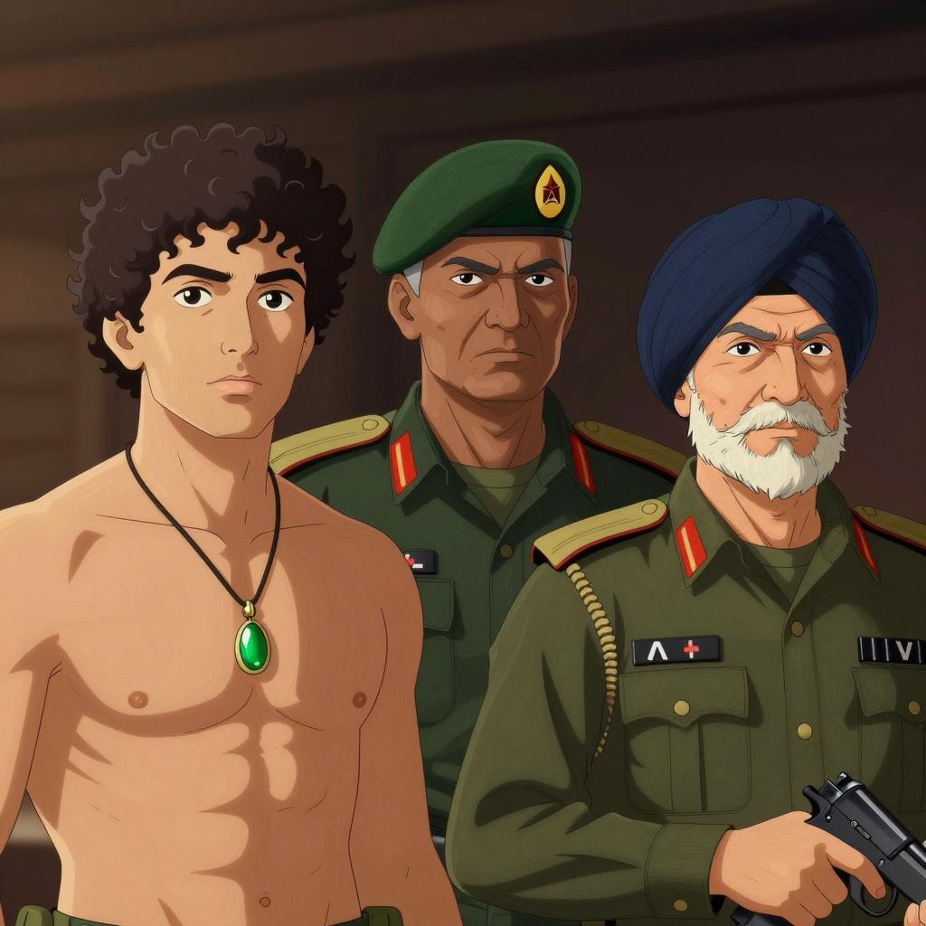 Photorealistic illustration featuring three men: a shirtless young man with curly black hair and a green pendant necklace in the foreground; an older man in a green military uniform and green beret with a stern expression in the middle; and another older man wearing a green military uniform and blue turban holding a gun on the right. The background is dark with warm lighting.
