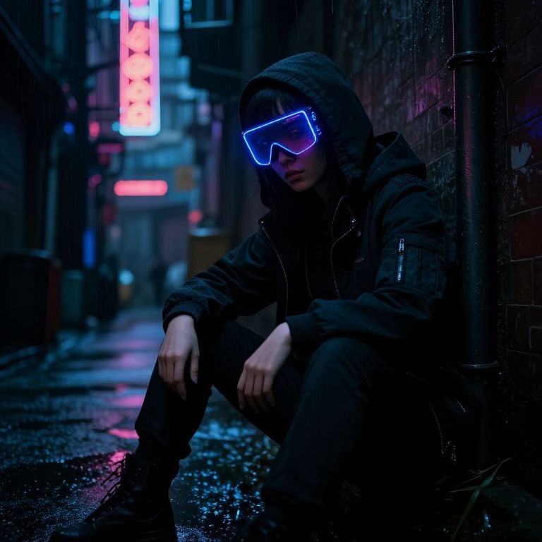 Photograph of a person sitting in a dimly lit, rain-soaked urban alley at night. The individual, wearing a dark hooded jacket and black pants, has glowing blue neon goggles that illuminate their face. The background features blurred neon signs in red and blue, adding a cyberpunk vibe. The wet alley floor reflects the neon lights, enhancing the moody atmosphere. The person's hands rest on their knees, and they are positioned against a brick wall on the right side of the image. The overall color palette is dark with striking neon accents.