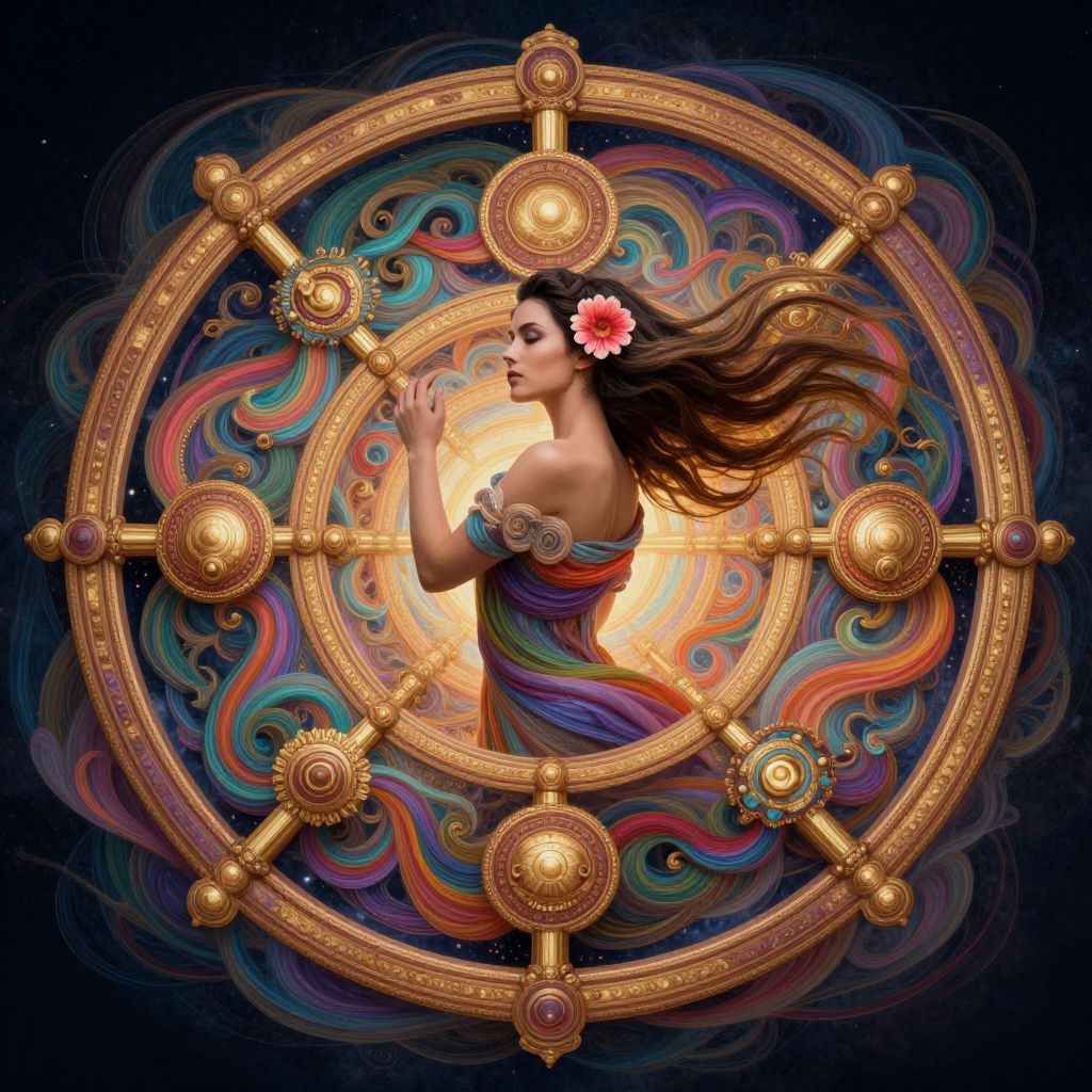 A woman with flowing hair and a flower in her hair is surrounded by a swirling, colorful, and intricate design that resembles a wheel of life.